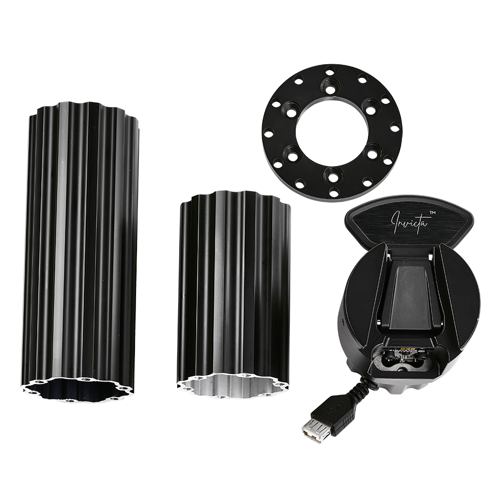 The Invicta Quick Release Adapter makes it possible to mount most steering wheels with a standard hole pattern (70mm x 6 & 50.8mm) on your Asetek SimSports wheelbase. This QR will allow the end user to adapt most sim wheels like GSI, Cube Controls, Ascher Racing, Turn Racing, Rexing, Bavarian Sim Tec and Simucube. The QR will supply power and data natively though the wheelbase. The QR includes three different lengths ( 80mm-150mm-200mm) and USB support.