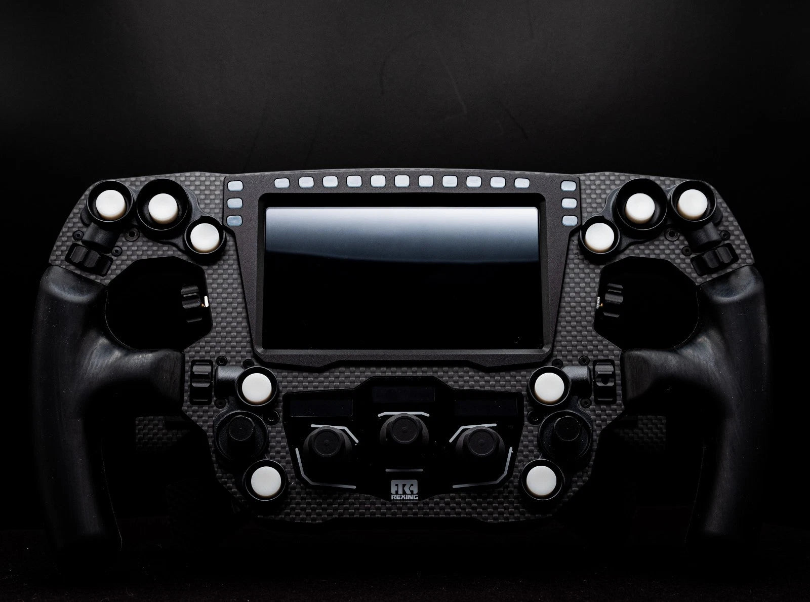 290 mm Formula-style rim with a 4.3″ LCD telemetry display, configurable RGB rev/flag LEDs, 10 backlit push buttons, multi-switch, six thumb rotary encoders, knobs for LED brightness and clutch bite-point.
